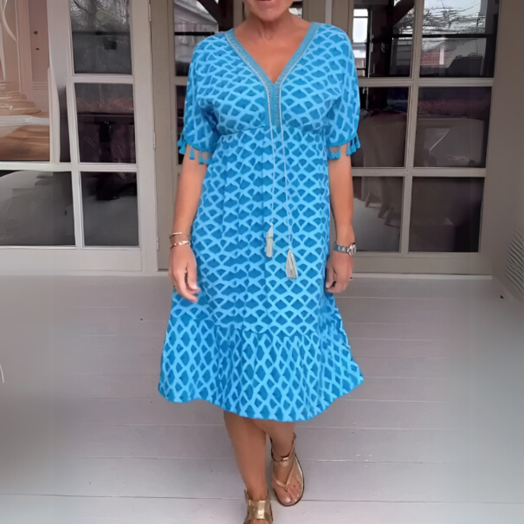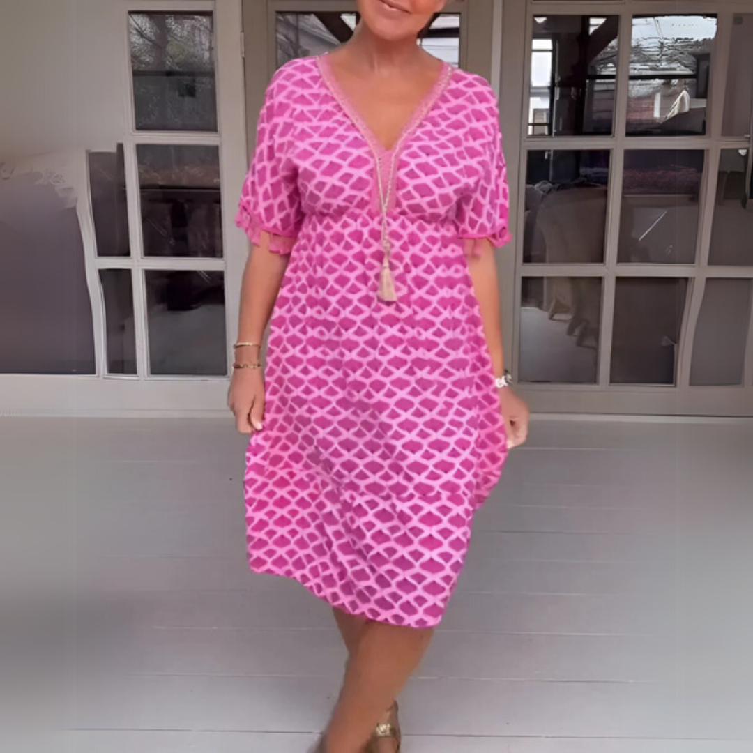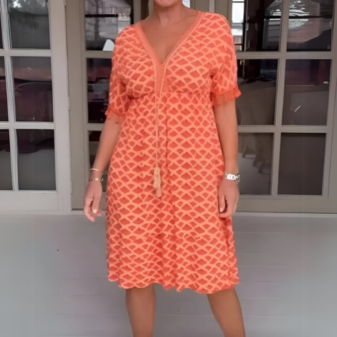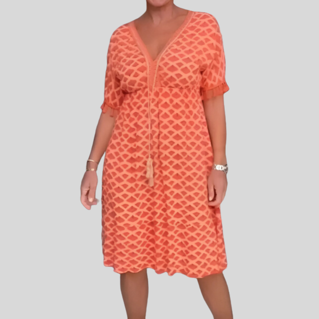 Are you looking for a dress that ensures not only comfort but also style? The model Eva is designed to give you confidence with every step. Its loose cut and V-neck ensure comfort and elegance, and thanks to the light and airy material, it is perfect for any occasion, whether for daily wear or evening events.