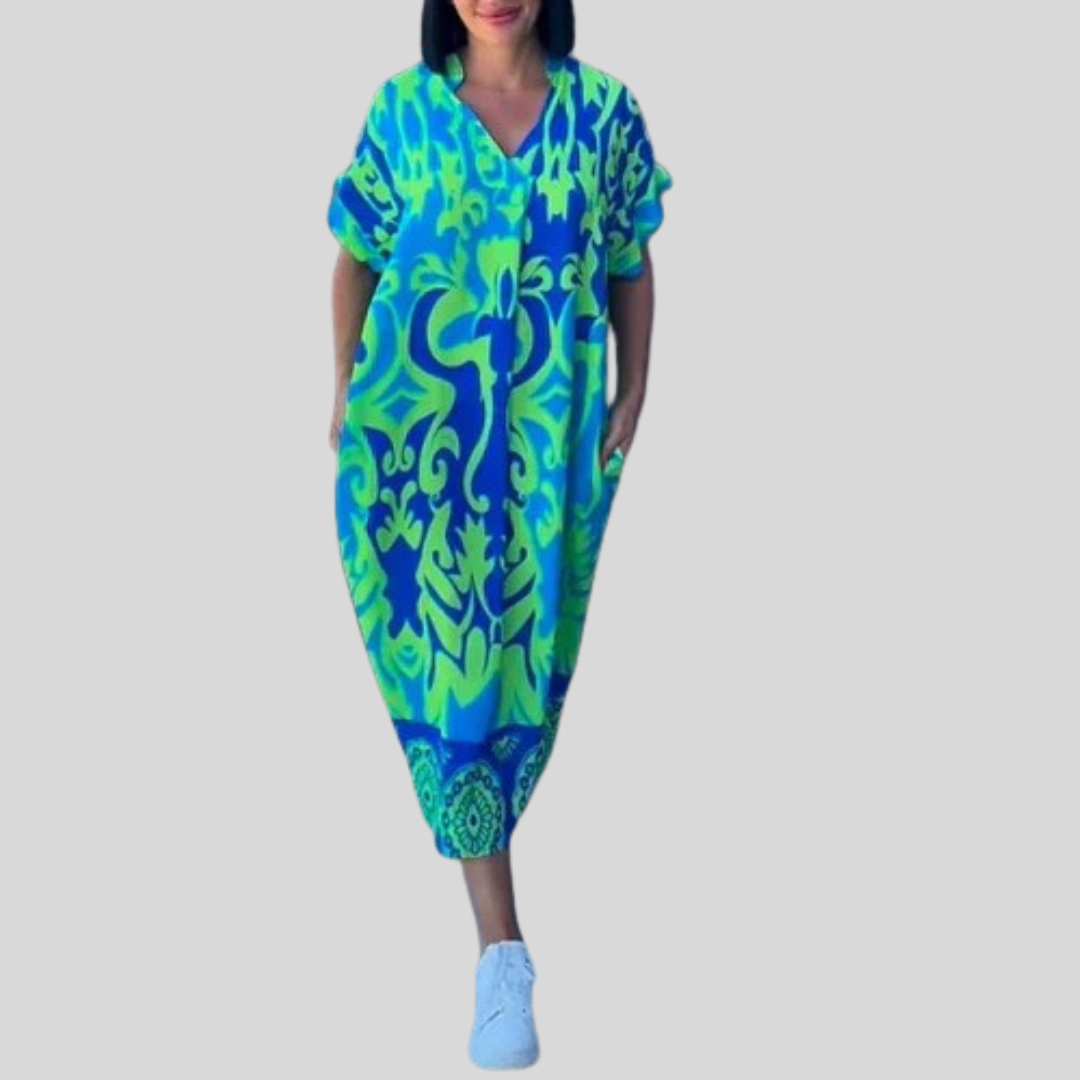 ✔ Elegant and timeless design – The soft floral pattern and flowing cut emphasize femininity and give the dress a spacious and refined look.