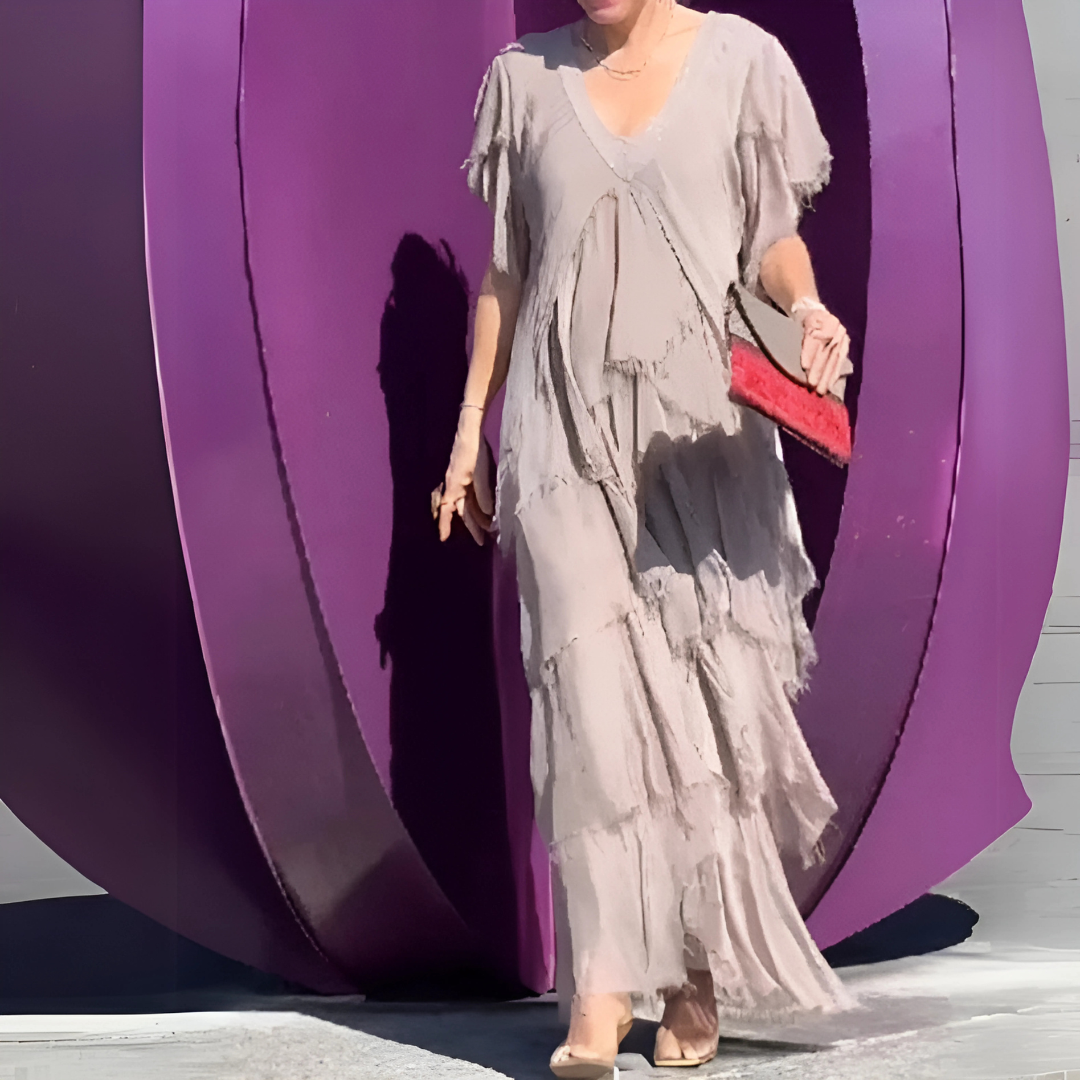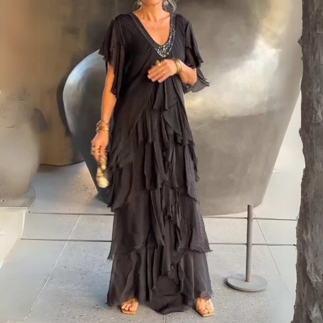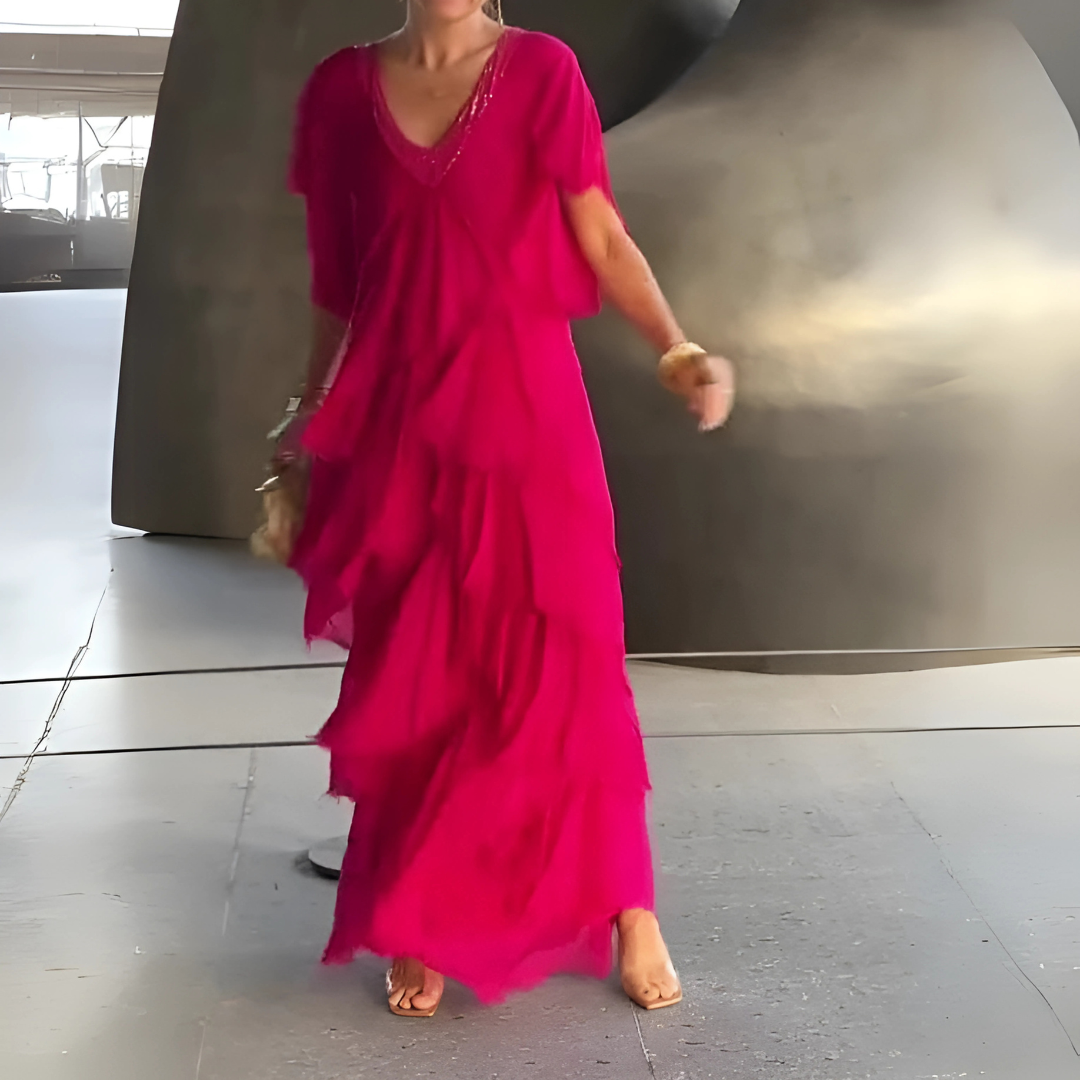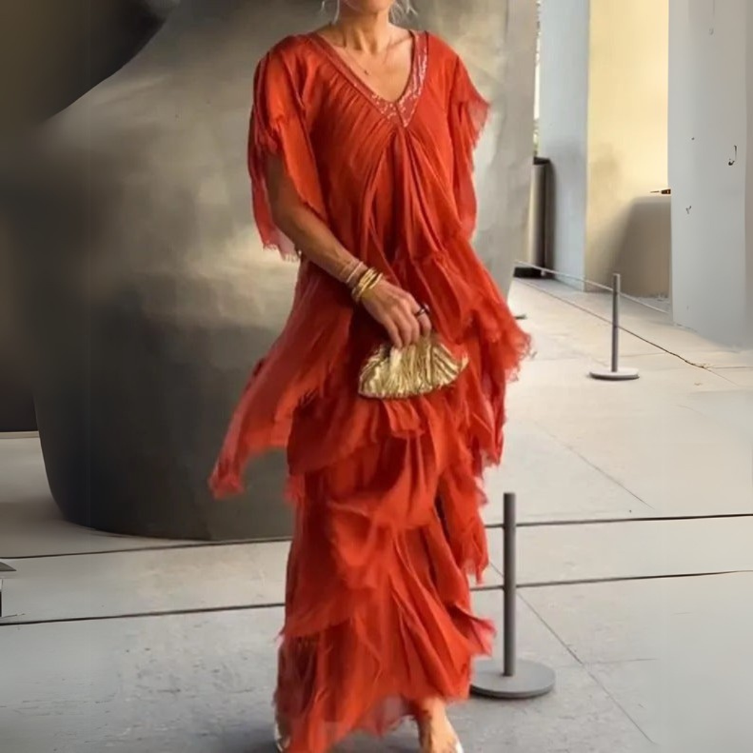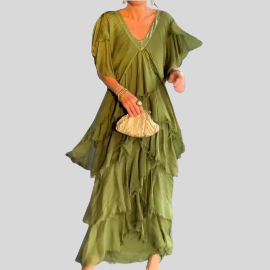 Are you looking for a dress that adds charm and elegance to any festive occasion? The model Valerie offers a soft and romantic look, thanks to the floral pattern and lightweight flowing fabric. Perfect for spring days, weddings, or romantic dinners.