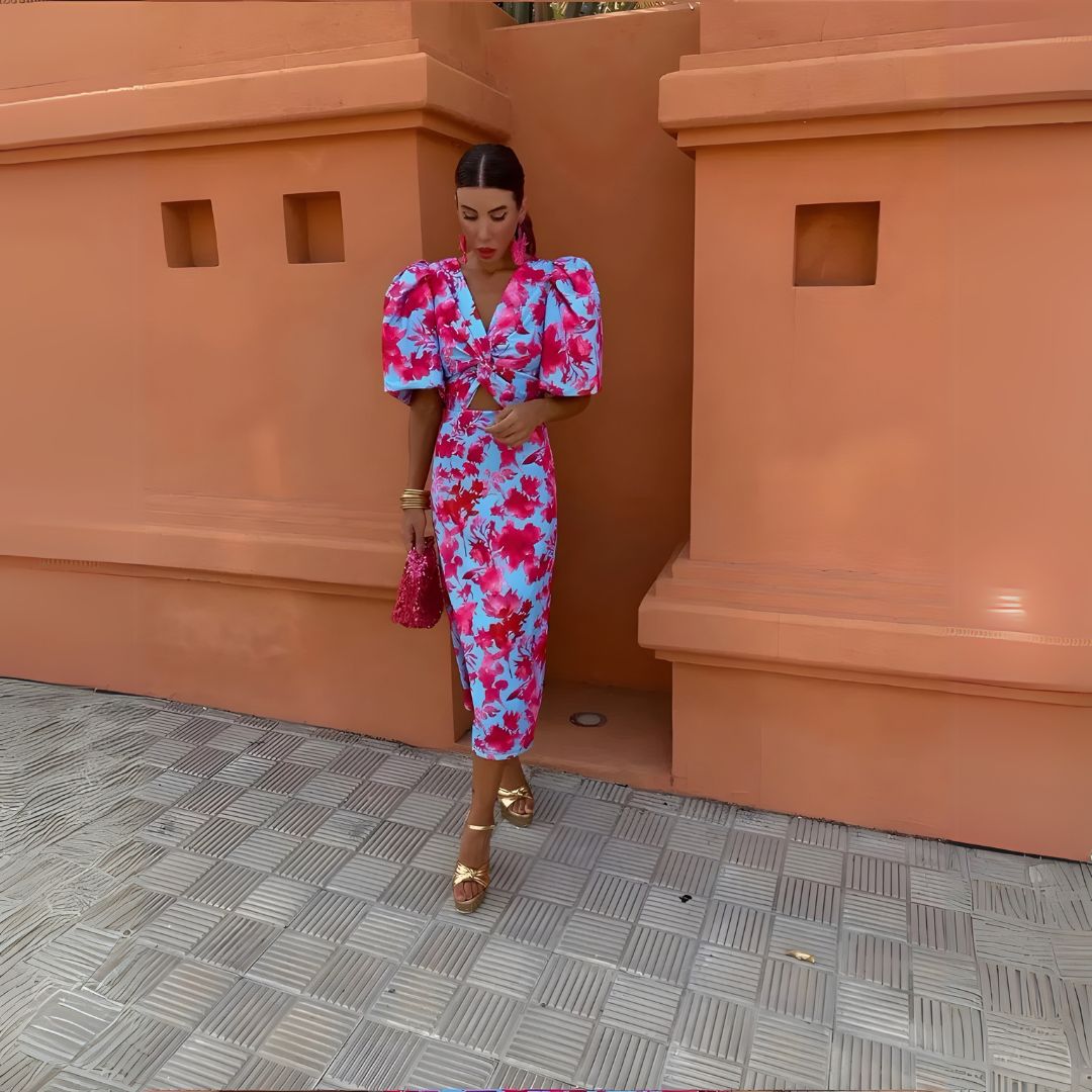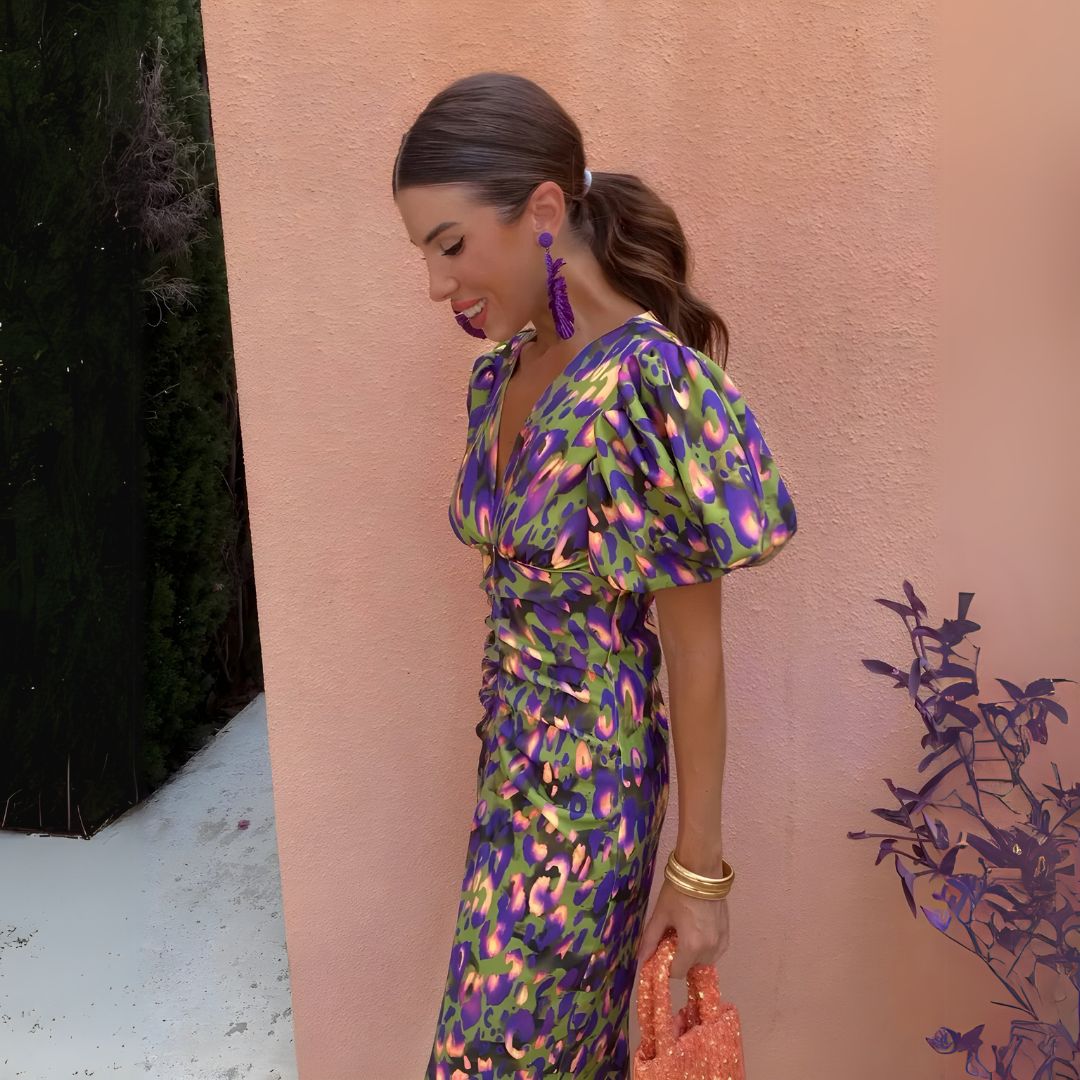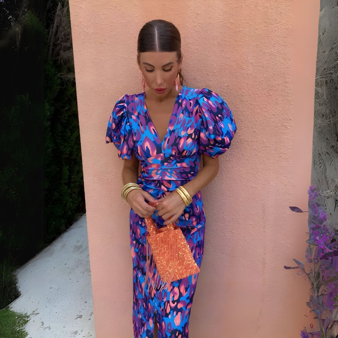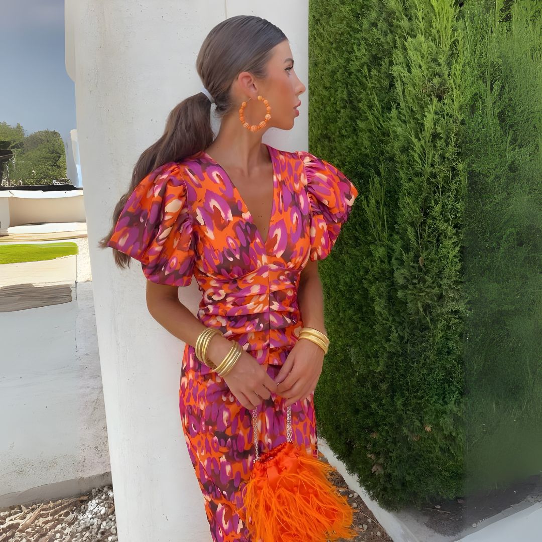 🔹 Type: Midi dress with a multicolored pattern and puffed sleeves