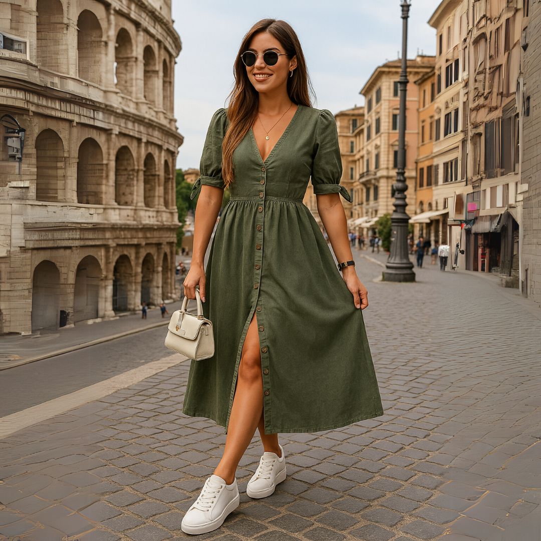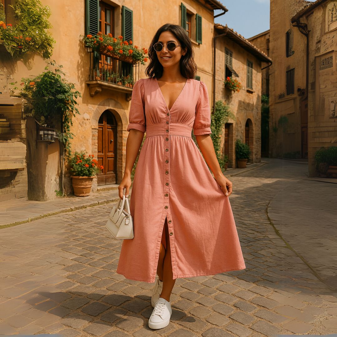 V-shaped neckline and subtle accents – Highlights femininity and provides effortless elegance.