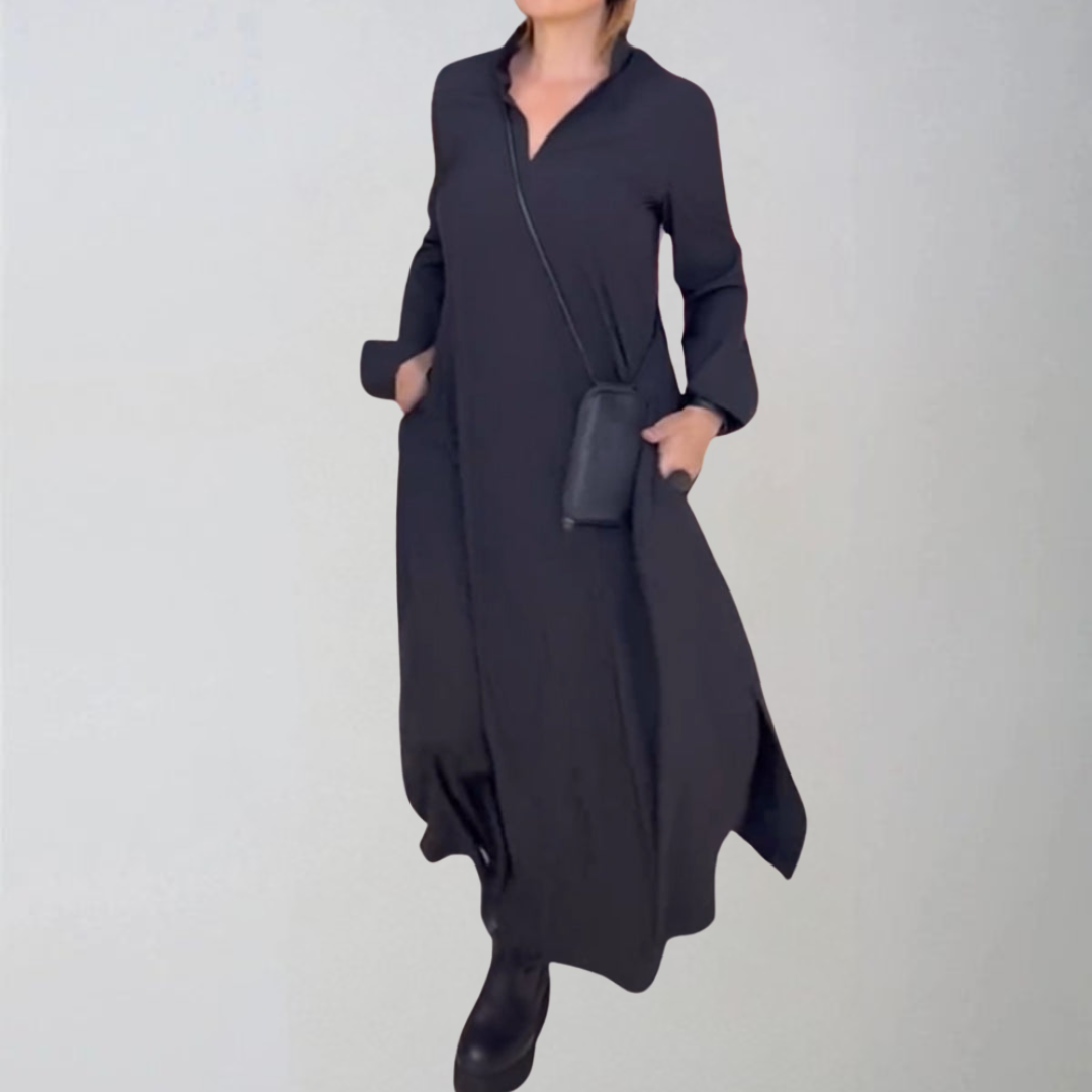The dress Tereza combines comfort and style with a timeless garment. The natural cut and elegant slit visually elongate the figure and create a sleek silhouette, perfect for any occasion.